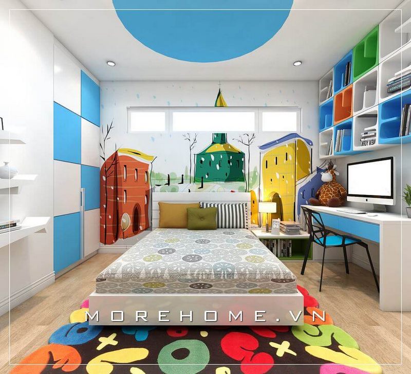 Màu sắc tươi sáng và hình ảnh vui nhộn không chỉ thu hút sự chú ý của trẻ mà còn kích thích trí tưởng tượng của các bé. Bạn có thể sử dụng giấy dán tường họa tiết ngộ nghĩnh hoặc sơn tường với các gam màu pastel nhẹ nhàng để tạo cảm giác thoải mái và ấm áp. Bên cạnh đó, việc lựa chọn đồ nội thất đa năng như giường kết hợp với ngăn kéo hay bàn học có thể gấp gọn giúp tối ưu hóa không gian.