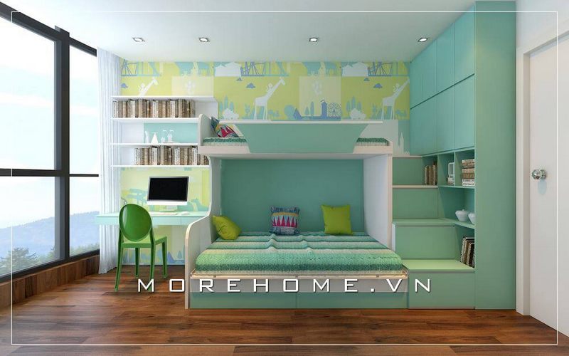 Mẫu thiết kế nội thất phòng ngủ trẻ em hiện đại dành cho các căn hộ nhỏ gọn với tông màu xanh làm chủ đạo.
